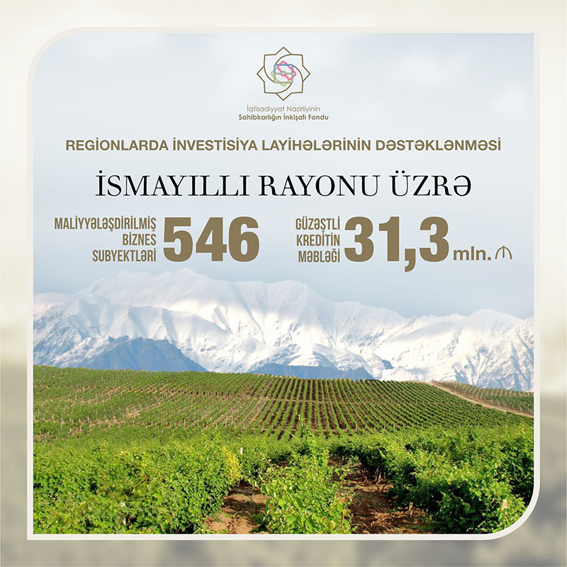 Marja-nın məlumatına görə, İqtisadiyyat Naziri Mikayıl Cabbarov bildirib ki, bugünədək Sahibkarlığın İnkişafı Fondu İsmayıllı rayonunda fəaliyyət göstərən 546 sahibkarlıq subyektinə 31,3 milyon manat güzəştli kredit verib.