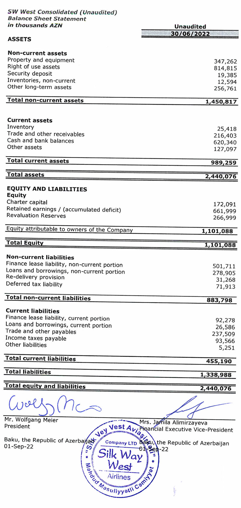 Qeyd edək ki, 2021-ci ildə "Silk Vey Vest Aviaşirkəti" MMC-nin cəmi əməliyyat gəlirləri 2 milyard 906 milyon 667 min manat, xalis mənfəəti isə 920 milyon 230 min manat təşkil etmişdi. Şirkət 2020-ci ildə isə 2 milyard 388 milyon 576 min manat cəmi əməliyyat gəlirləri, 630 milyon 392 min manat xalis mənfəəti əldə etmişdi.