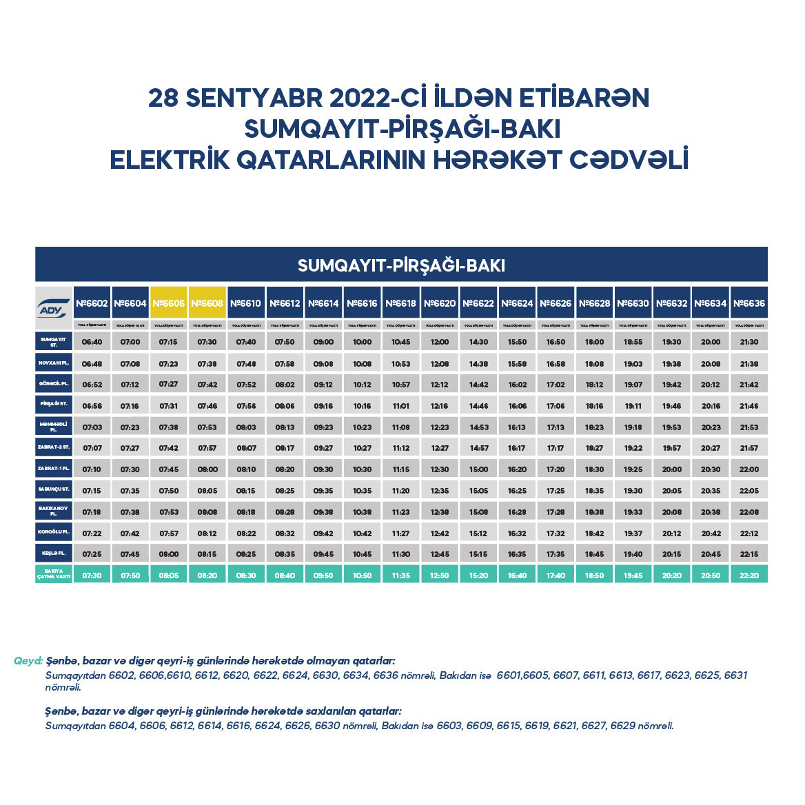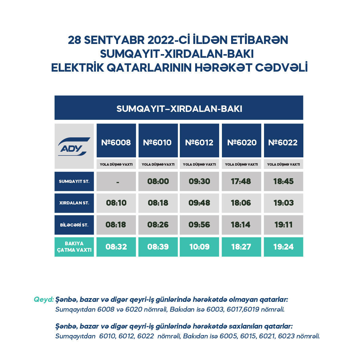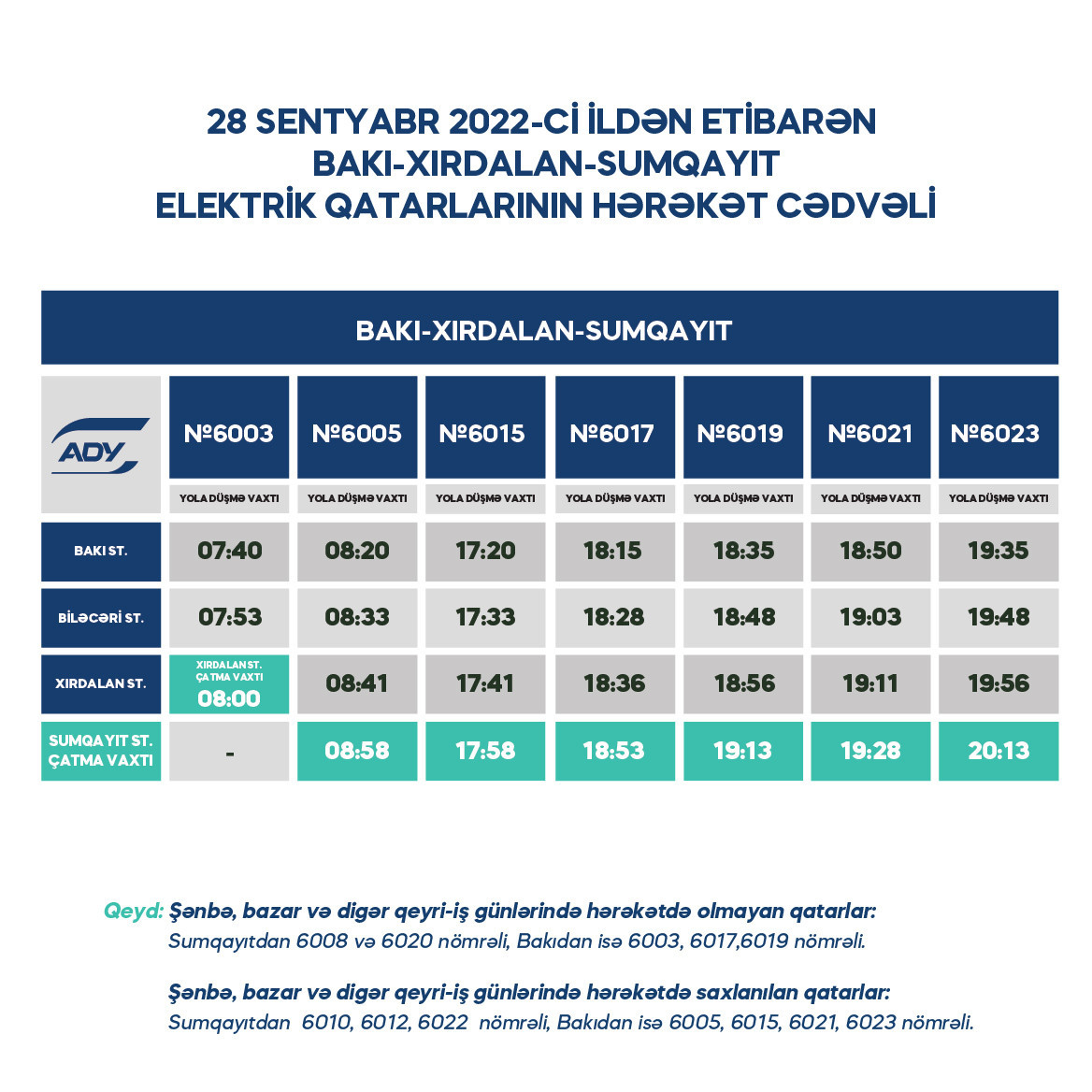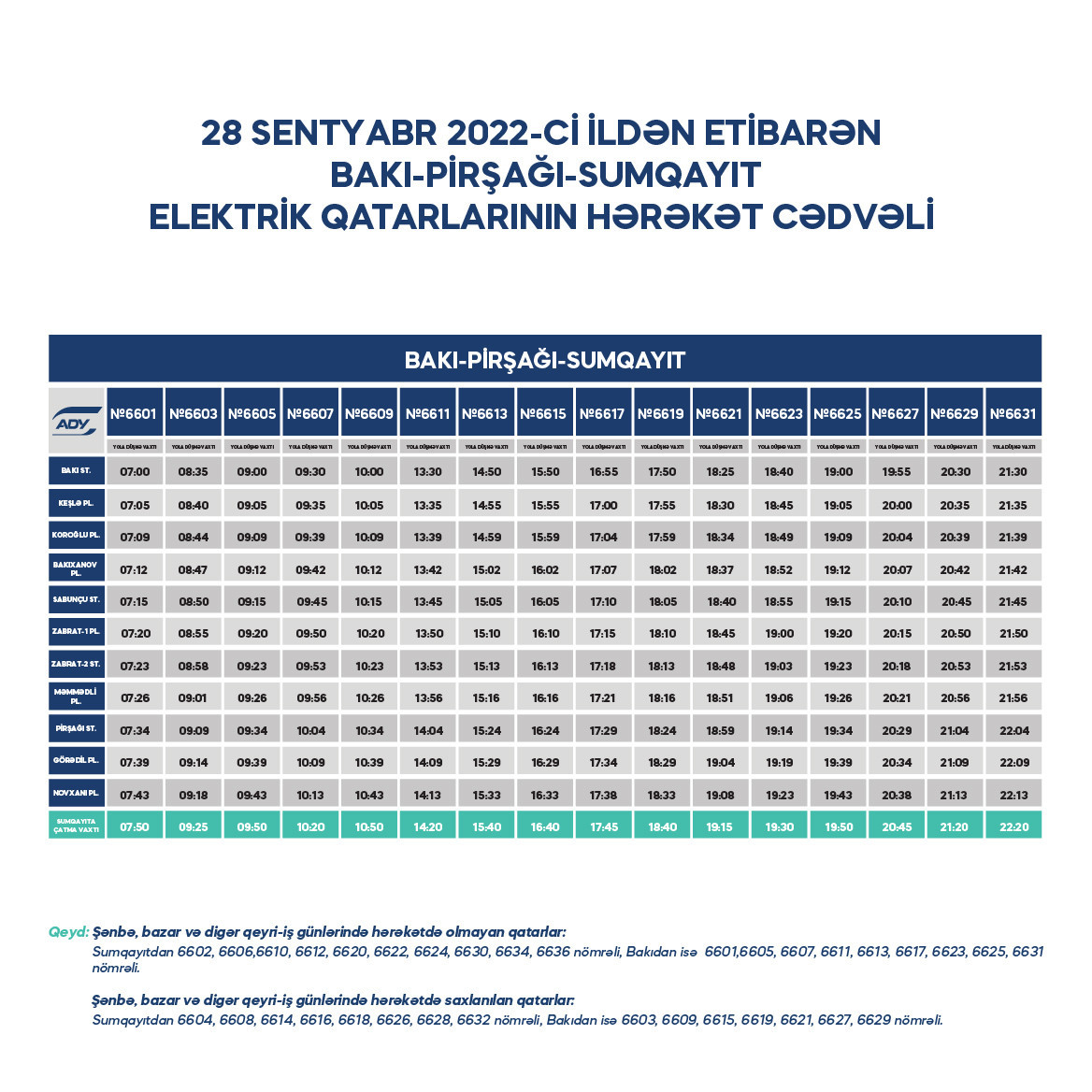 Qeyd olunub ki, Sumqayıtdan saat 07:25-də çıxan qatar yeni qrafiklə saat 07:15-də hərəkət edəcək və əlavə olunmuş qatar isə saat 07:30-da Sumqayıt stansiyasından yola düşəcək.