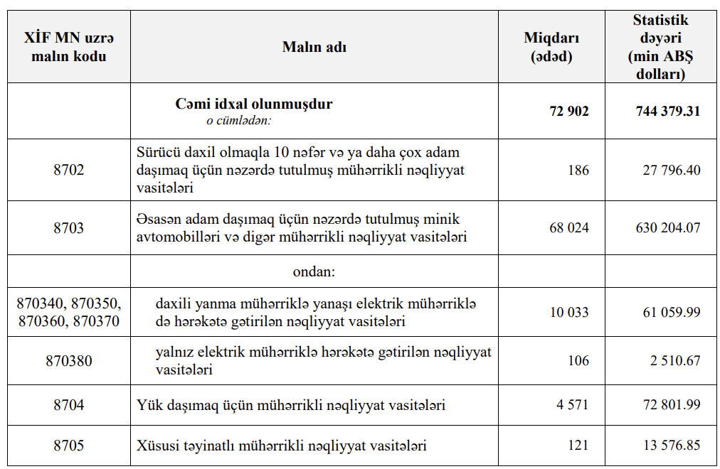 Azərbaycana 84 milyon dollar daha çox vəsaitə 12 min ədəd daha az avtomobil gətirilib.
