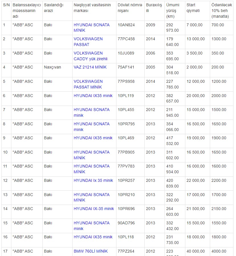 "ABB" ASC-nin (Azərbaycan Beynəlxalq Bankı) balansında olan 17 nəqliyyat vasitəsi hərraca çıxarılacaq.