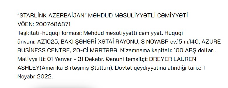 Noyabrın 1-də “Starlink" peyk internet provayderinin ("SpaceX") törəmə şirkəti olan “Starlink Azerbaijan” MMC Bakıda qeydiyyatdan keçib.