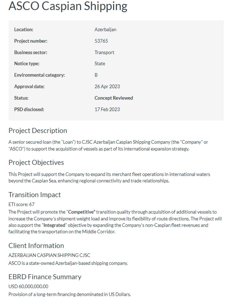 Avropa Yenidənqurma və İnkişaf Bankı (AYİB, EBRD) dövlətə məxsus "Azərbaycan Xəzər Dəniz Gəmiçiliyi" QSC-yə (ASCO) 60 milyon ABŞ dolları uzunmüddətli kredit ayıracaq.
