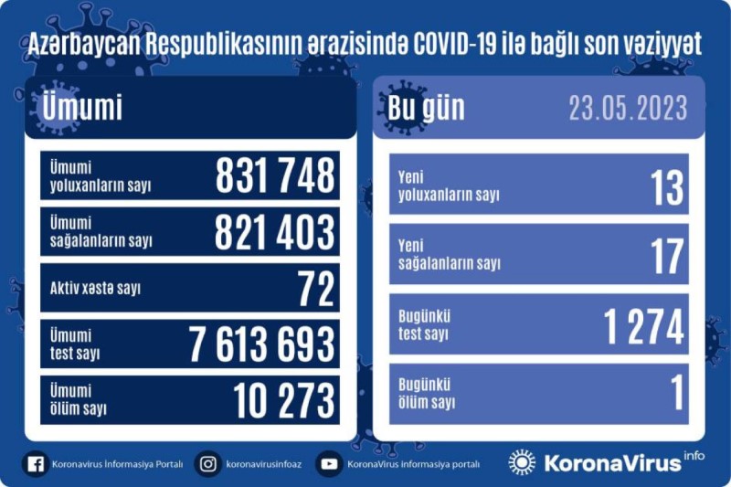 Azərbaycan Respublikasında koronavirus (COVID-19) infeksiyasına 13 yeni yoluxma faktı qeydə alınıb, 17 nəfər müalicə olunaraq sağalıb.