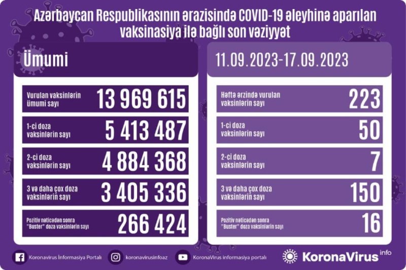 Azərbaycanda sentyabrın 11-dən 17-dək koronavirus (COVID-19) əleyhinə 223 vaksin vurulub.