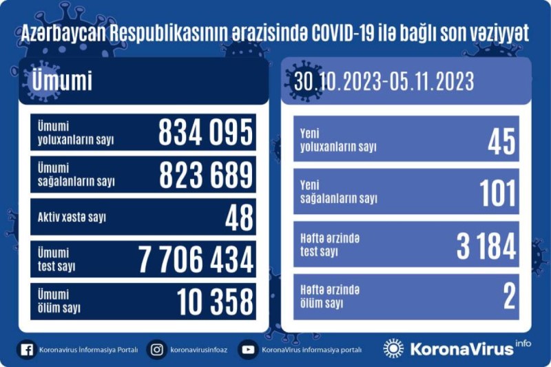 Azərbaycanda koronavirus (COVID-19) infeksiyasına son 1 həftədə (30.10.2023-05.11.2023) 45 yeni yoluxma faktı qeydə alınıb, 101 nəfər müalicə olunaraq sağalıb.