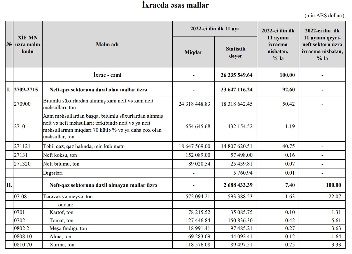 Müqayisə üçün qeyd edək ki, 2022-ci ilin yanvar-noyabr dövründə (11 ayda) Azərbaycandan 33 milyard 647 milyon 116 min dollarlıq neft-qaz sektoruna daxil olan mallar, o cümlədən 18 milyard 318 milyon 642 min dollarlıq xam neft, 14 milyard 807 milyon 620 min dollarlıq təbii qaz ixrac edilmişdi.