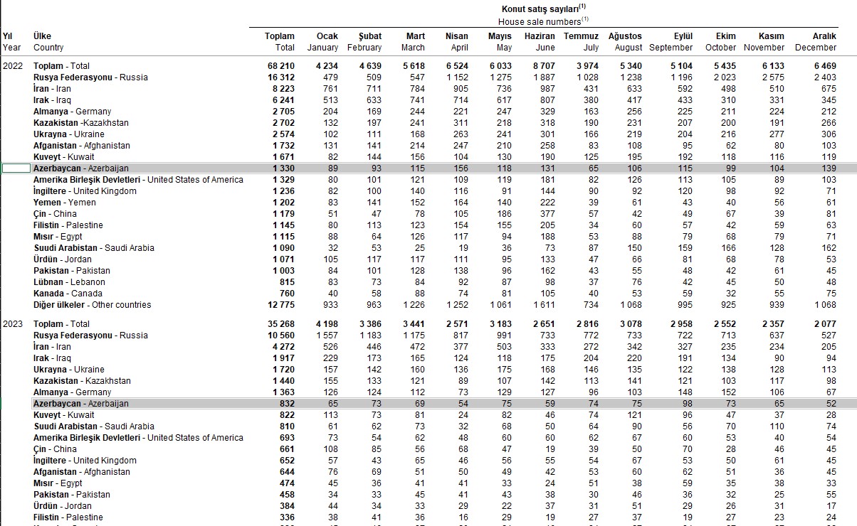 2023-cü ilin 12 ayı ərzində (yanvar-dekabr) Azərbaycan vətəndaşları Türkiyədə 832 ev alıblar. Bu say 2022-ci ildə 1330 ev idi. Beləlikə, azərbaycanlılar Türkiyədə 59,8% daha az ev alıblar.