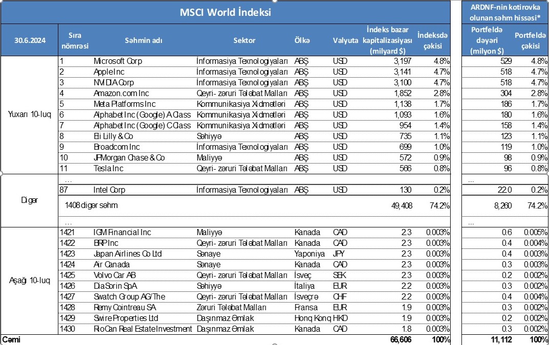 “MSCI World” indeksinin izlənilməsi üzrə göstəricilər* (30 iyun 2024-cü il tarixinə)