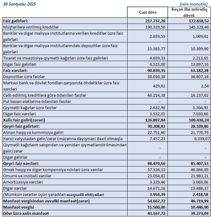 Buna baxmayaraq, bank xalis mənfəətini 43 milyon 168 min manata qədər artırıb. Ötən ilin 9 ayında bu göstərici 39 milyon 273 min manat idi. Yəni, mənfəət 3 milyon 895 min manat və ya 9,9% artıb. Bu artım əvvəlki illərlə müqayisədə daha mülayim olsa da, artım tendensiyasının davam etməsi bankın sabit fəaliyyətini göstərir.