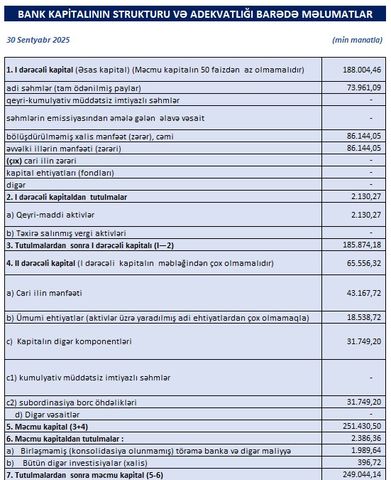 30 sentyabr 2025-c il tarixində “Bank Respublika”nın məcmu kapitalı 249 milyon manata çatıb, bu da ötən ilin sonu ilə müqayisədə 42 milyon manat və ya 20,4% artım deməkdir. Bu, bankın kapital adekvatlığının və riskə davamlılığının gücləndiyini təsdiqləyir.
