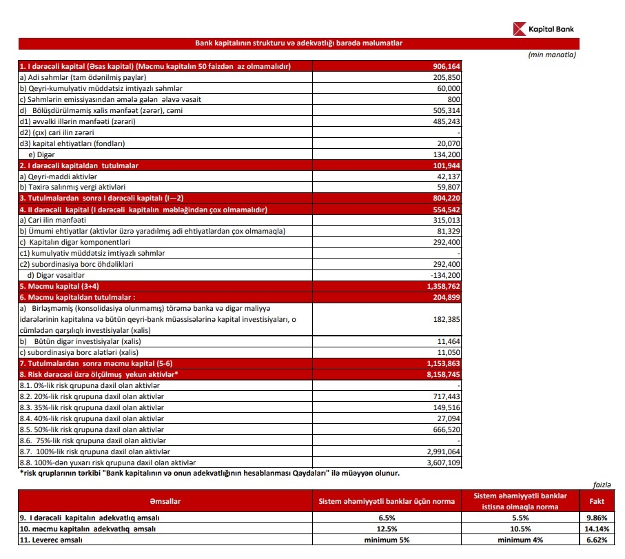 "Kapital Bank" ASC 2025-ci ili 315 milyon 13 min manat xalis mənfəət ilə başa vurub. Bank 2024-cü ili 186 milyon 501 min manat xalis mənfəət ilə bağlamışdı. Beləliklə, "Kapital Bank"ın xalis mənfəəti 2025-ci ildə 2024-cü illə müqayisədə 128 milyon 512 min manat və ya 68,9% artıb.