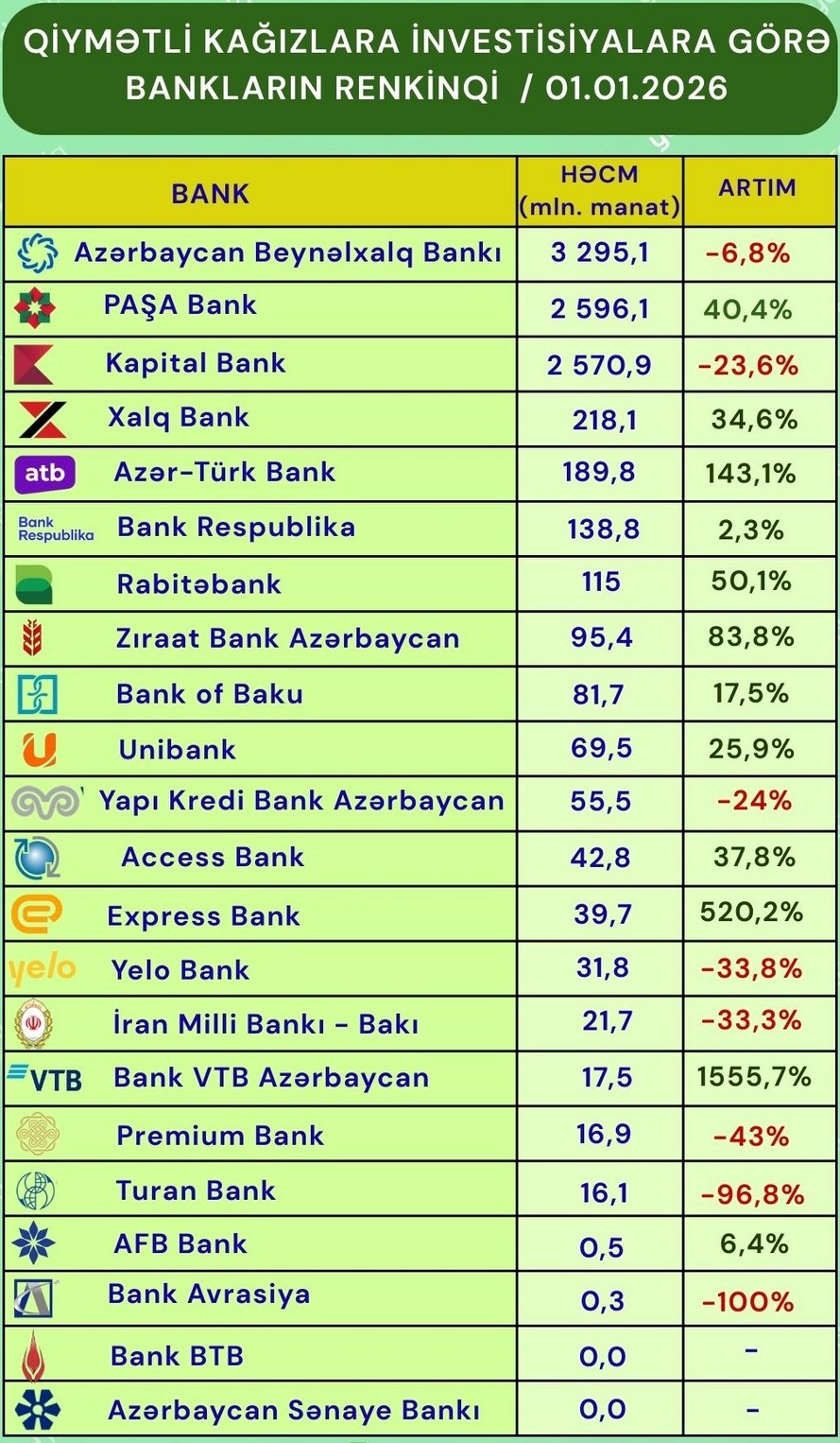 2 bankın isə kapital bazarına investisiyaları olmayıb.
