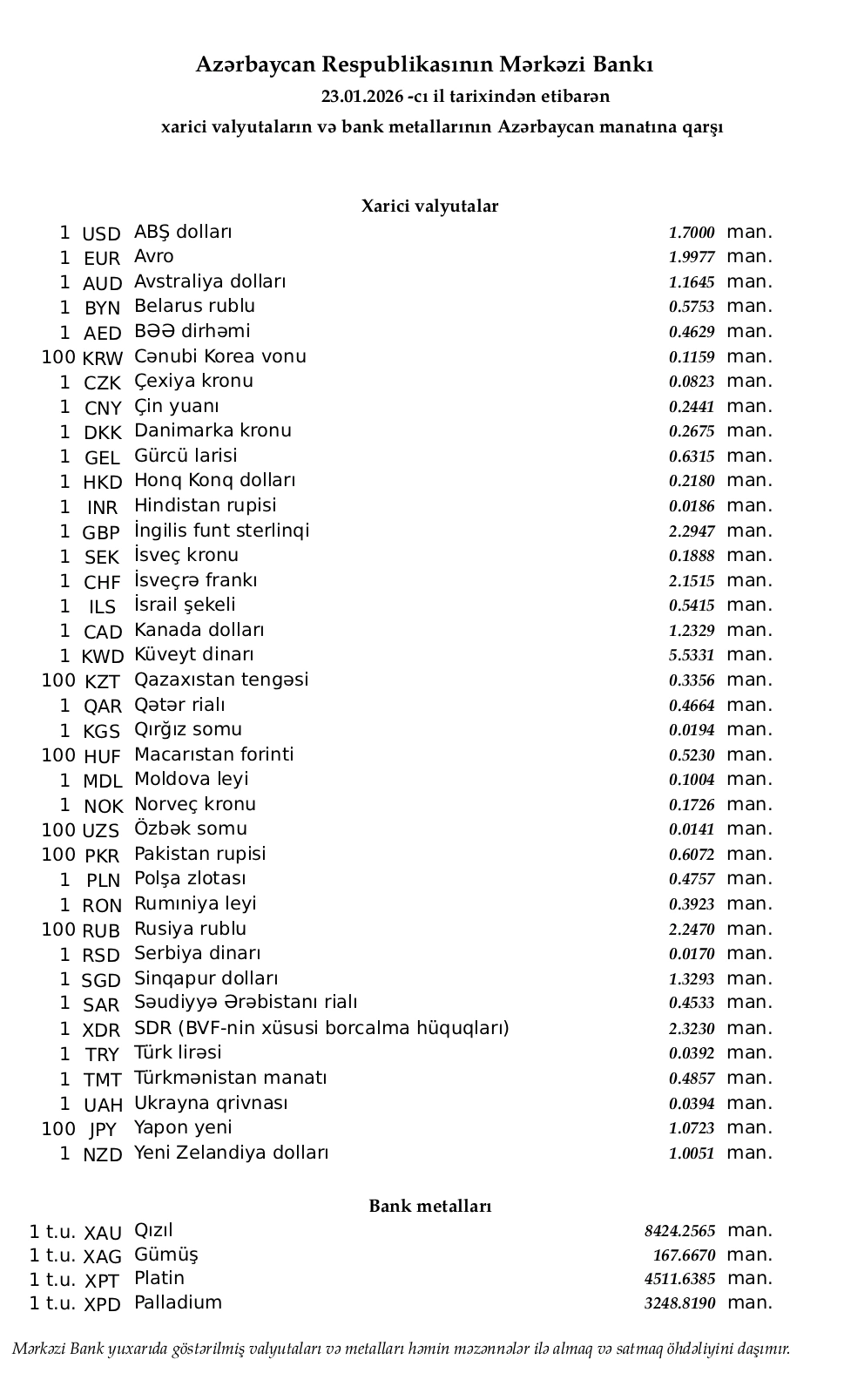 Rəsmi məzənnələr açıqlandı