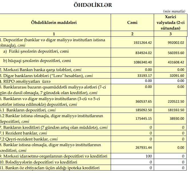 Fiziki şəxslərin depozitləri 948 milyon 270 min manatdan 834 milyon 924 min manata düşərək 113 milyon 346 min manat və ya 11,9 faiz azalıb.