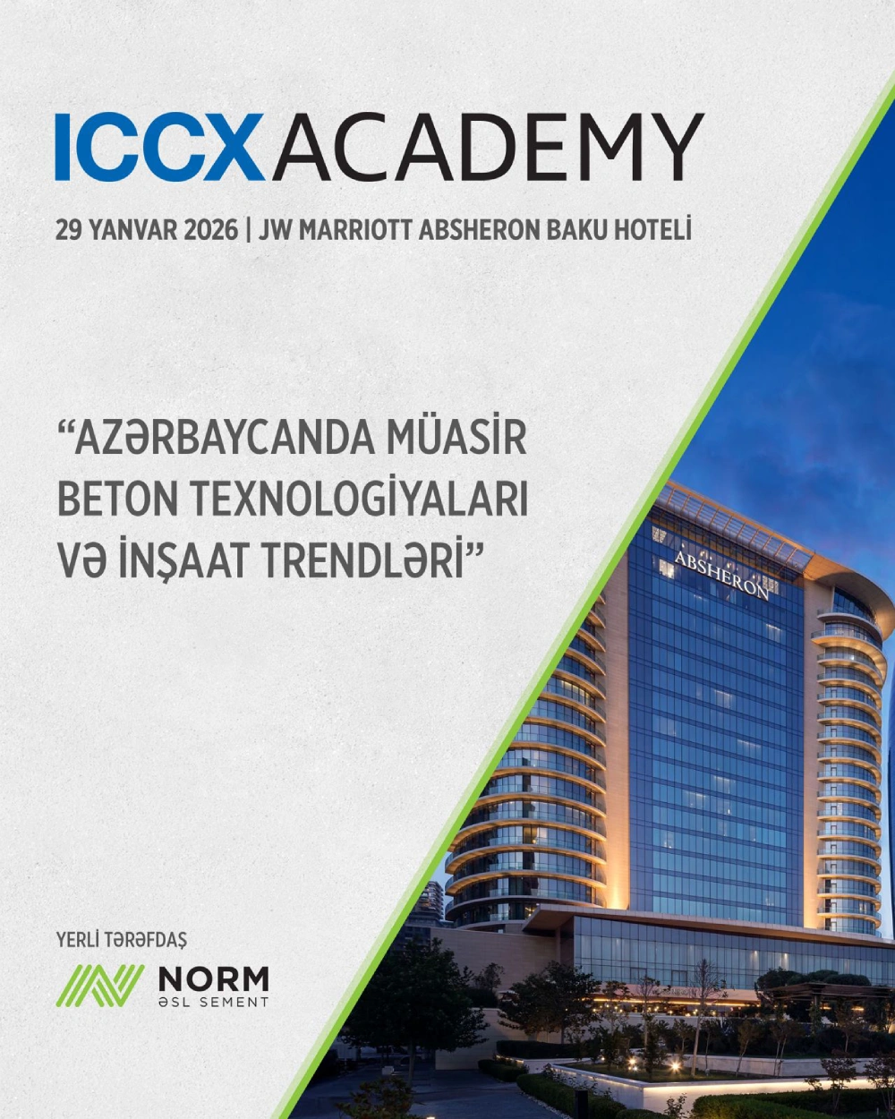 ICCX Academy Baku beynəlxalq beton konfransı beton sərgisi Bakı inşaat sənayesi Azərbaycan Norm şirkəti JW Marriott Absheron Baku beton texnologiyaları müasir beton istehsalı inşaat innovasiyaları dayanıqlı inkişaf beton trendləri inşaat materialları beynəlxalq inşaat təcrübəsi Avropa və Şərq inşaat bazarı beton sənayesi inşaat sərgisi ICCX konfransı Norm ASC NEQSOL Holding tikinti sektoru Azərbaycan beynəlxalq şirkətlərin iştirakı beton avadanlıqları və həlləri inşaat peşəkarları sənaye dialoq platforması