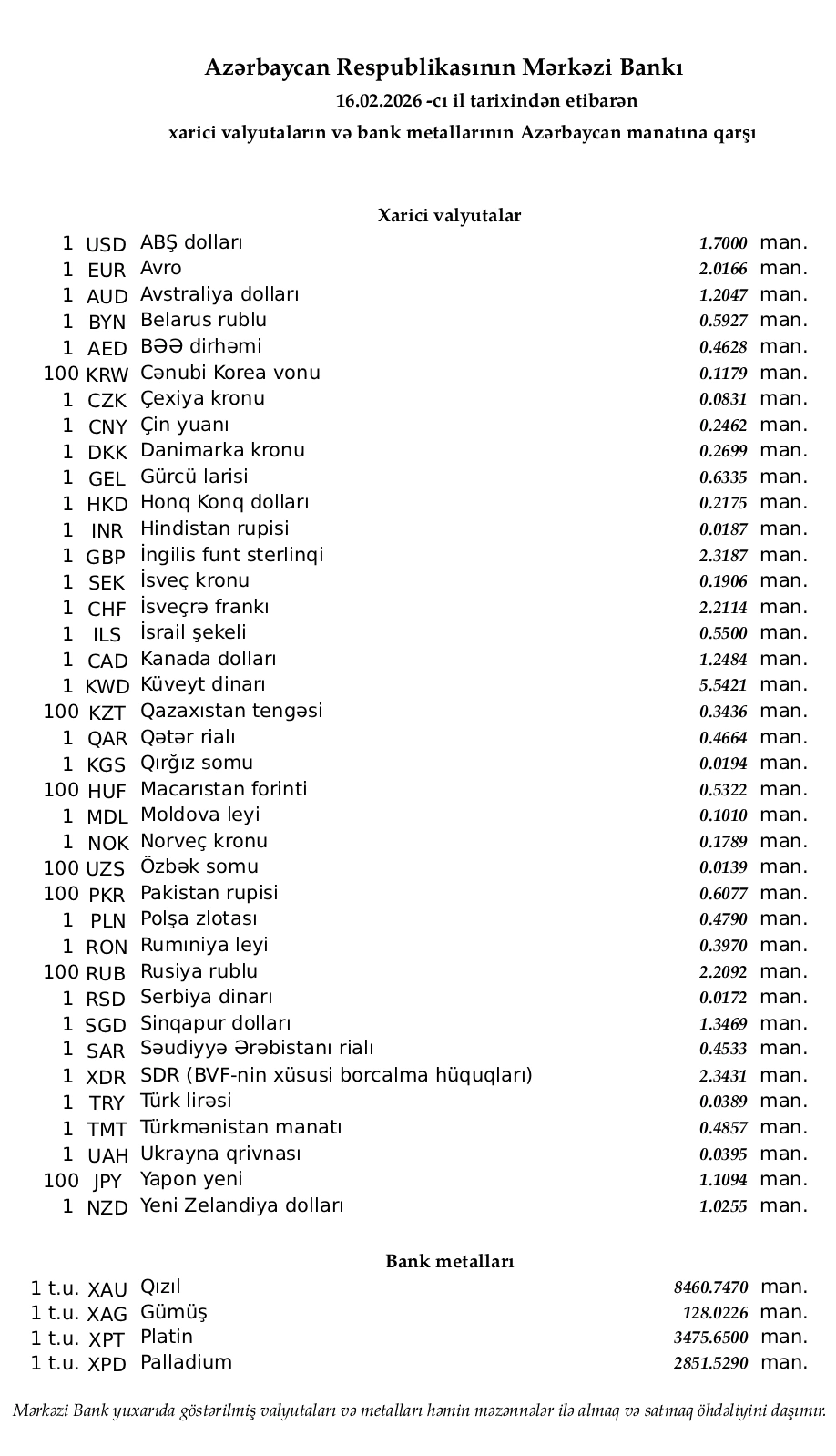 Rəsmi məzənnələr açıqlandı