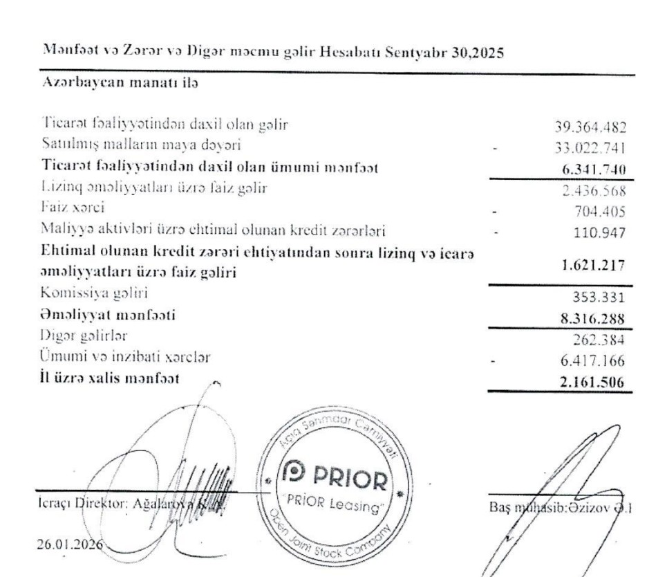 "Prior Leasing" ASC-nin audit olunmuş maliyyə hesabatına görə, Şirkət 2024-cü ili 1 milyon 178 min manat xalis mənfəət ilə bağlamışdır. (2023-cü ildə 1 milyon 20 min manat).
