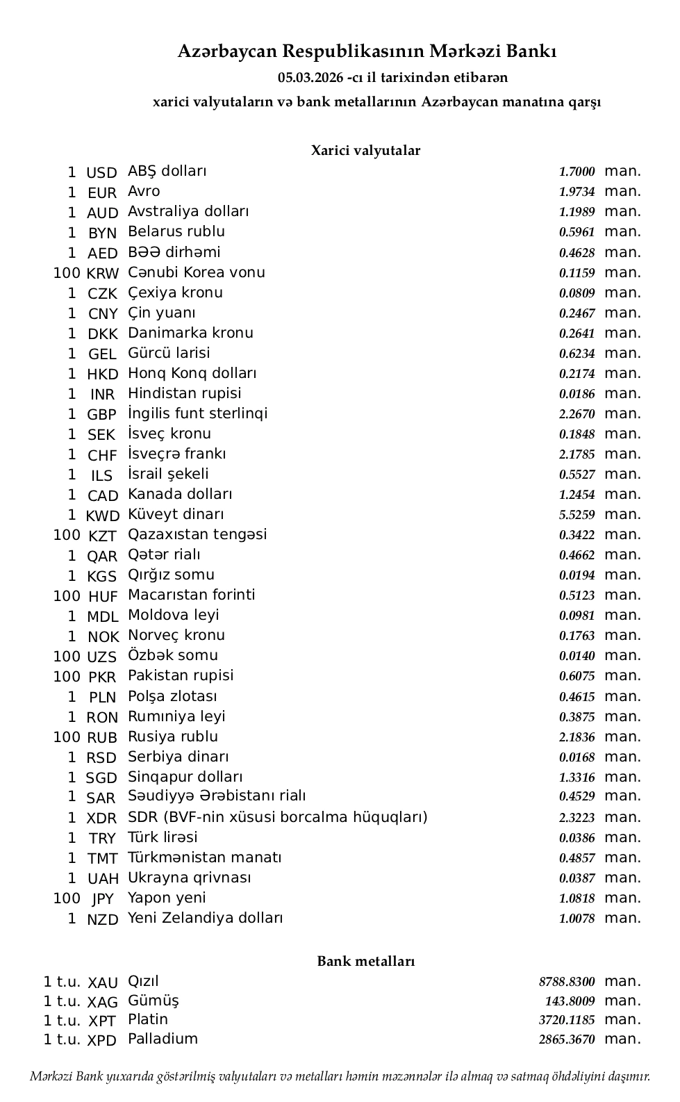 Rəsmi məzənnələr açıqlandı