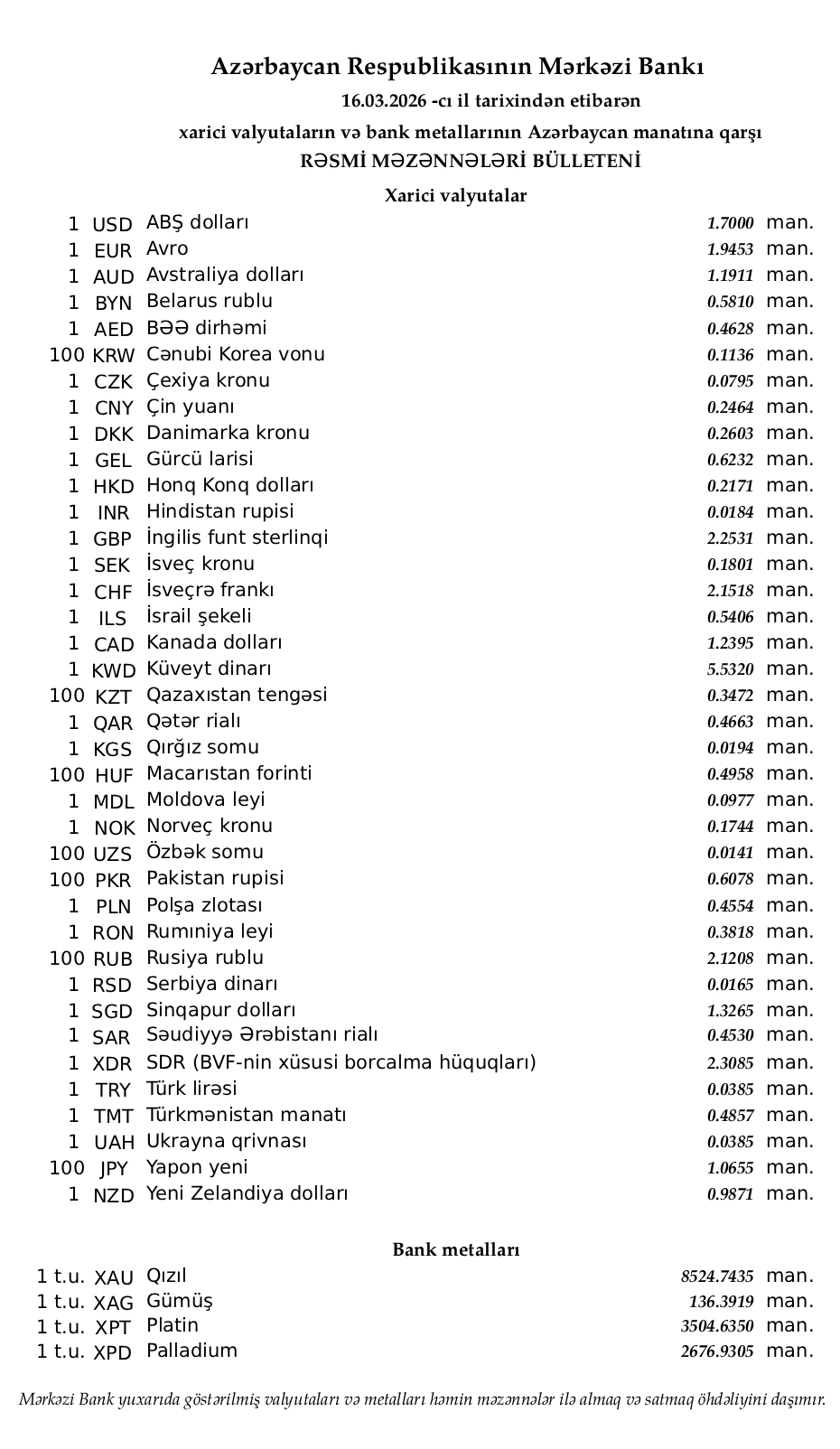 Dolların bazar ertəsi üçün rəsmi məzənnəsi müəyyən olunub