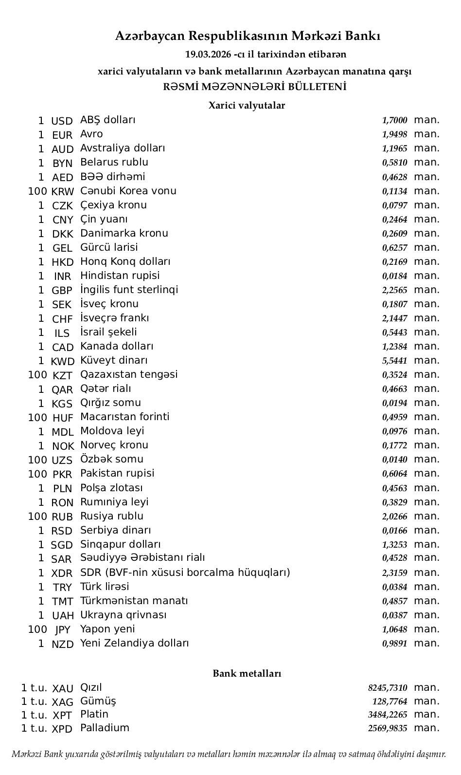 Dolların 31 Mart üçün rəsmi məzənnəsi müəyyən olunub
