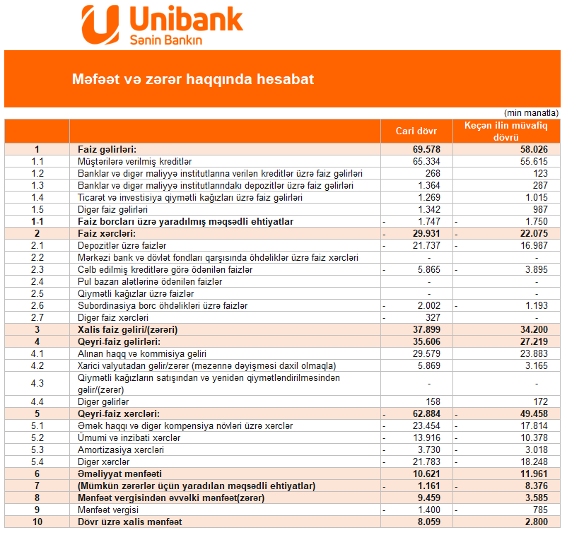 Unibank-ın yaydığı press-relizdə bildirilir ki, Bank əsas maliyyə göstəriciləri üzrə müsbət nəticələr əldə edib.