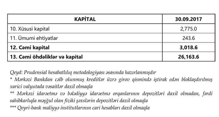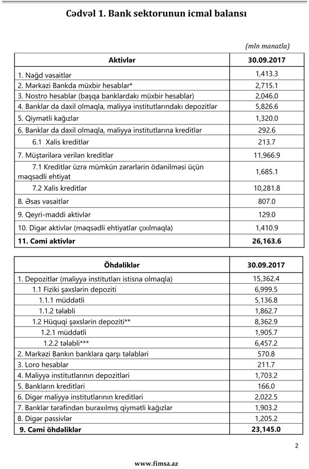 2017-ci ilin 30 sentyabr tarixinə olan bank sektorunun əsas göstəriciləri bank sektorunun icmal göstəricilərində öz əksini tapmışdır.