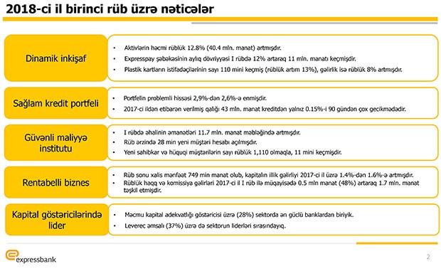 2018-ci ilin ilk rübündə Bankın əməliyyat mənfəəti 7 milyon 29 min manat, ümumi inzibati xərclər isə 6 milyon 280 min manat təşkil edib. Nəticədə Bank ilk rübü 749 min manat xalis mənfəətlə bağlayıb.