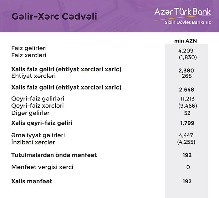 Bütün xərclər çıxıldıqdan sonra “AzərTürkBank” ilk rübü 192 min manat xalis mənfəətlə bağlayıb. Bank 2017-ci ilin ilk rübünü 1 milyon 65 min manat xalis mənfəət ilə başa vurmuşdu.