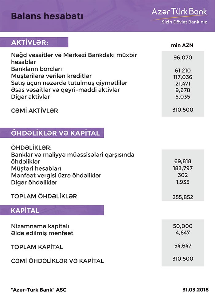 31 Mart 2017-ci il taixində “AzərTürkBank”ın cəmi aktivləri 288 milyon 861 min manat ikən, 31 Mart 2018-ci il taixində 310 milyon 500 min manata qalxıb. Bankın müştərilərə verdiyi kreditlər isə 140 milyon 101 min manatdan 117 milyon 36 min manata düşüb. “AzərTürkBank”ın nağd və Mərkəzi Bankdakı müxbir hesablardakı vəsaitləri 59 milyon 927 min manatdan 96 milyon 70 min manata yüksəlib.