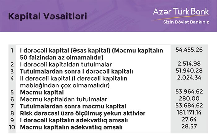 31 Mart 2018-ci il taixində “AzərTürkBank” 53 milyon 684 min manat məcmu kapitala malik olub.
