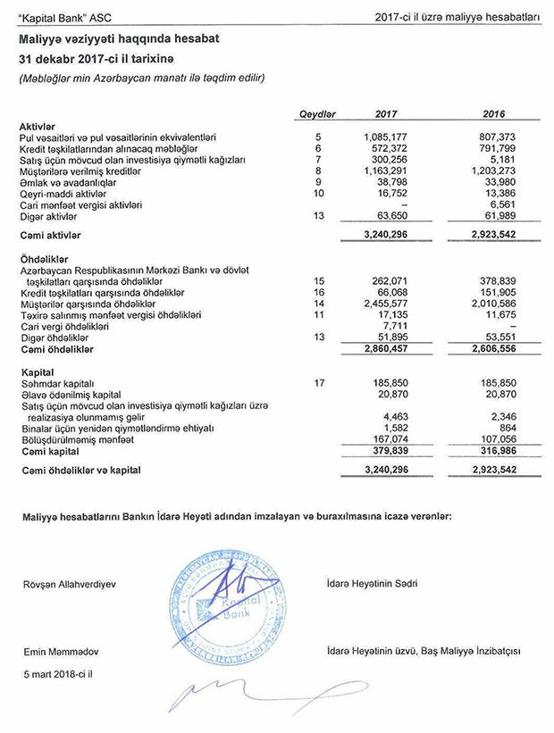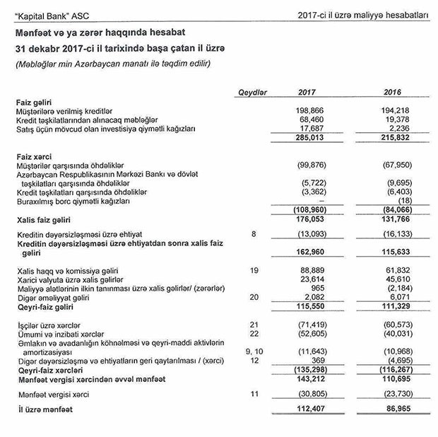 “Kapital Bank” ASC-nin audit olunmuş hesabatına görə, Bank 2017-ci ili 112 milyon 407 min manat xalis mənfəət ilə başa vurub. Bundan əvvəl yerli standartlar əsasında hazıranmış rüblük hesabatda qeyd edimişdi ki, Bank 2017-ci ili 94 milyon 839 min manat xalis mənfəətlə başa vurub. Beləliklə, “Kapital Bank” 2017-ci ili 17 milyon 568 min manat daha çox xalis mənfəətlə bağlayıb.