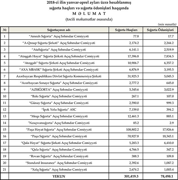 2018-ci ilin yanvar-aprel ayları ərzində ölkədə fəaliyyət göstərən 21 sığorta şirkəti tərəfindən 301.4 mln. manat məbləğində sığorta haqları toplanıb və 78.5 mln. manat məbləğində sığorta ödənişi həyata keçirilib. Bu barədə "Marja"ya Maliyyə Bazarlarına Nəzarət Palatasından bildirilib.
