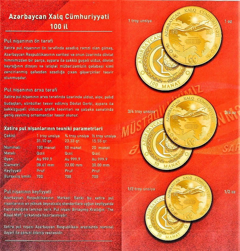 Azərbaycan Mərkəzi Bankı da bu əlamətdar tarixin əbədiləşdirilməsi məqsədilə Cümhuriyyətin yaradılmasının 100 ilik yübileyinə hər olunmuş xatirə pul nişanlarını tədavülə buraxır. Xatirə pul nişanları çəkisi 1 , ¾ və ½ troy unsiyası olan yüksək əyarlı qızıldan ibarətdir.