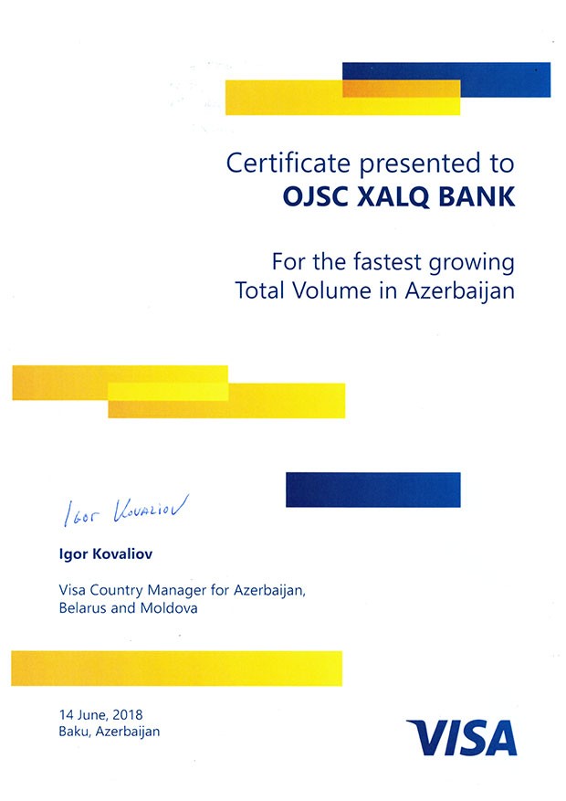 ASC “Xalq” Bankı nağdsız ödənişlərin stimullaşdırılması istiqamətində həyata keçirdiyi səmərəli tədbirlər və Visa plastik kartlarının ümumi əməliyyat dövriyyəsində nail olduğu ən sürətli artım tempinə görə Visa International beynəlxalq ödəniş sistemi tərəfindən sertifikatla təltif edilib. Bu barədə "Marja"ya Bankdan bildirlib.