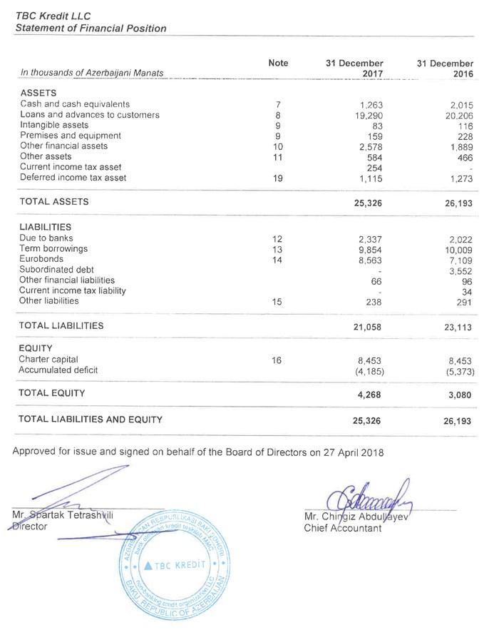 31 Dekabr 2017-ci il tarixində “TBC Kredit”in cəmi aktivləri 25 milyon 326 min manat, o cümlədən müştərilərə verilmiş kreditlər 19 milyon 290 min manat təşkil etmişdir. 2016-cı ilin sonunda təşkilatın kredit portfeli 26 milyon 193 min manat, o cümlədən kredit portfeli 20 milyon 206 min manat təşkil etmişdi. “TBC Kredit” 2018-ci ildə kredit şərtlərini daha sərfəli edib və fəaliyyətini gücləndirib.