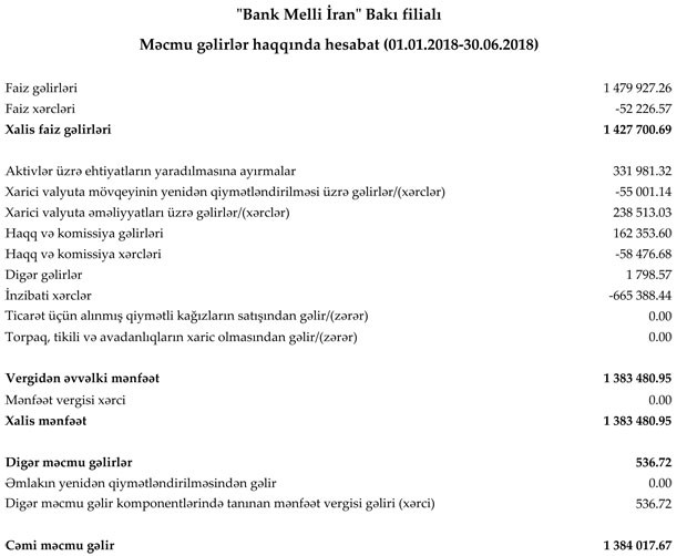 "Bank Melli İran" Bakı filialı 2017-ci ilin birinci yarısını 750 min 502 manat xalis mənfəətlə bağlamışdı. Həmin dövrdə filialın faiz gəlirləri 1 milyon 465 min manat, haqq və komissiya gəlirləri 97 min 290 manat təşkil etmişdi.