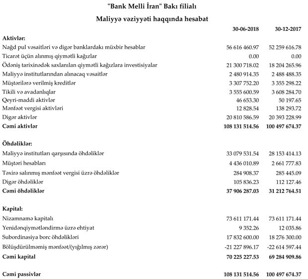 "Bank Melli İran" Bakı filialı son maliyyə vəziyyətini açıqladı