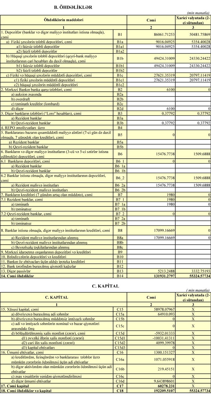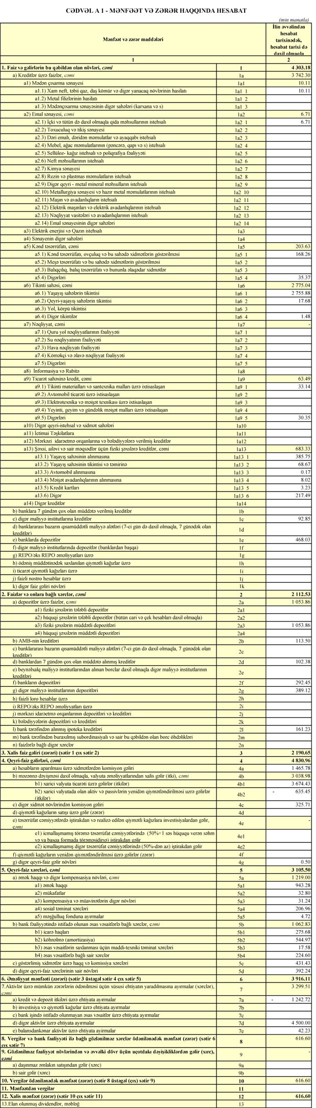 Xərclər çıxıldıqdan sonra Bankın 3 milyon 916 min manat əməliyyat mənfəəti qalıb. Əməliyyat mənfəətinin 3 milyon 299 min manatı aktivlər üzrə (ehtimal olunan kredit və depozit itkiləri üzrə ) mümkün zərərlərin ödənilməsi üçün xüsusi ehtiyatın yaradılmasına ayrıldığından Bankın xalis mənfəəti 617 min manat təşkil edib.