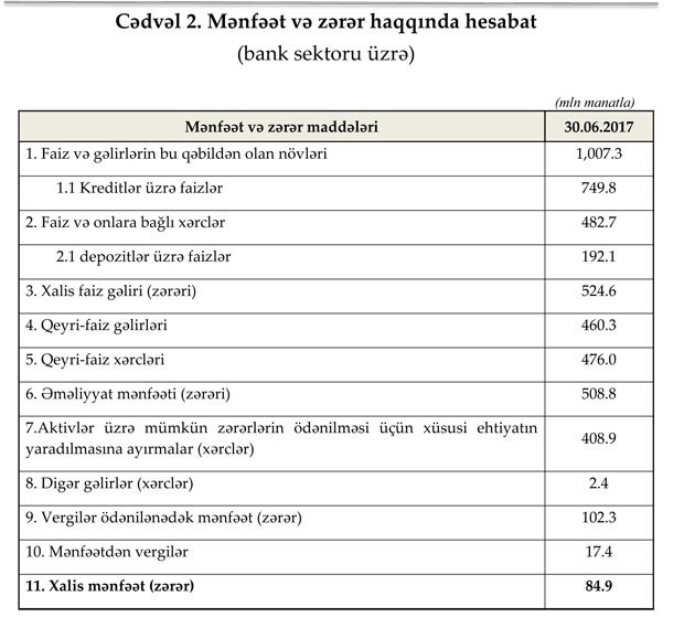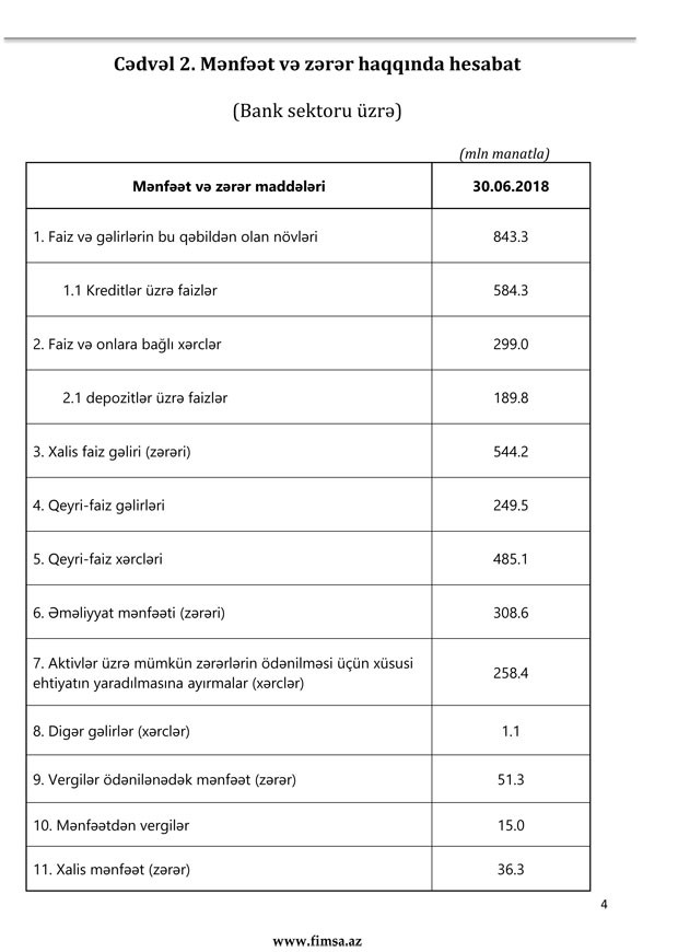 Bu ilin birinci yarısında, banklar əməliyyat mənfəətinin 258,4 milyon manatını aktivlər üzrə mümkün zərərlərin ödənilməsi üçün xüsusi ehtiyatın yaradılmasına ayırıblar (ötən il 408.9 milyon manat). Eyni zamanda, 15 milyon manat mənfəət vergisi ödənilib. Nəticədə bank sektoru 2018-ci ilin birinci yarısını 36,3 milyon manat xalis mənfəətlə bağlayıb. Qeyd edək ki, bir neçə iri bank böyük məbləğdə mənfəət əldə etdiyindən digər bankların böyük məbləğdə zərərləri bağlanıb.