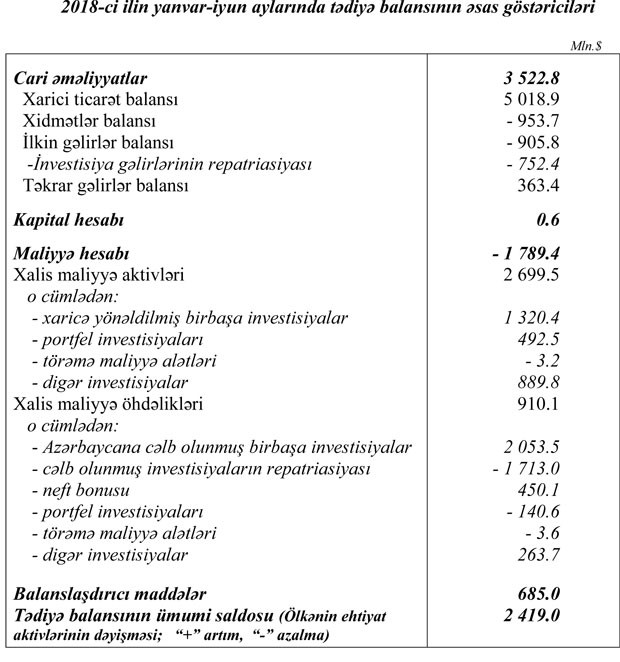 2018-ci ilin yanvar-iyun ayları üzrə Azərbaycanın tədiyə balansının ümumi profisiti 1.7 milyard dollar təşkil etmişdir.