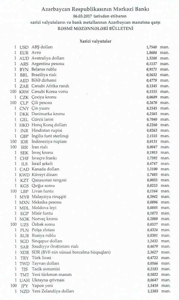 Martın 3-də 1 dollar 1,7548 manata, 1 avro isə 1.8460 manata bərabər idi.