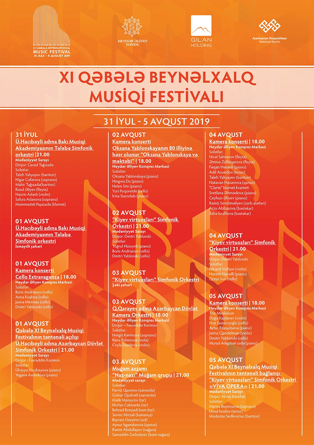Heydər Əliyev Fondunun və “Gilan Holding”-in təşkilatçılığı ilə keçirilən XI Qəbələ Beynəlxalq Musiqi Festivalının təntənəli açılış mərasimi 01 avqust 2019-cu il tarixində Heydər Əliyev adına Konqres Mərkəzində baş tutacaqdır. Festivalda müxtəlif musiqi janrlarında çıxış edən görkəmli musiqiçilər, solistlər, dirijorlar iştirak edəcəklər.