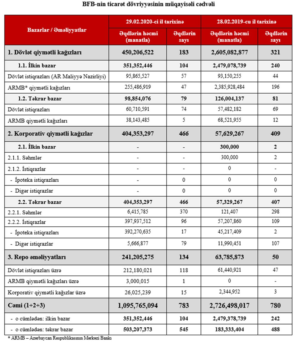 2020-ci ilin yanvar-favral dövründə təkrar korporativ qiymətli kağızlar bazarında isə 404 milyon 353 min manat həcmində əməliyyat aparılıb. Bu, ötən ilin eyni dövrü ilə müqayisədə 7 dəfə çoxdur.