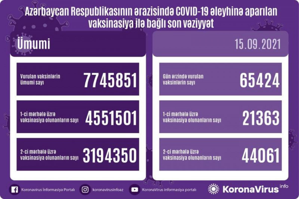 Azərbaycanda son sutkada koronavirus (COVID-19) əleyhinə 65424 vaksin vurulub.