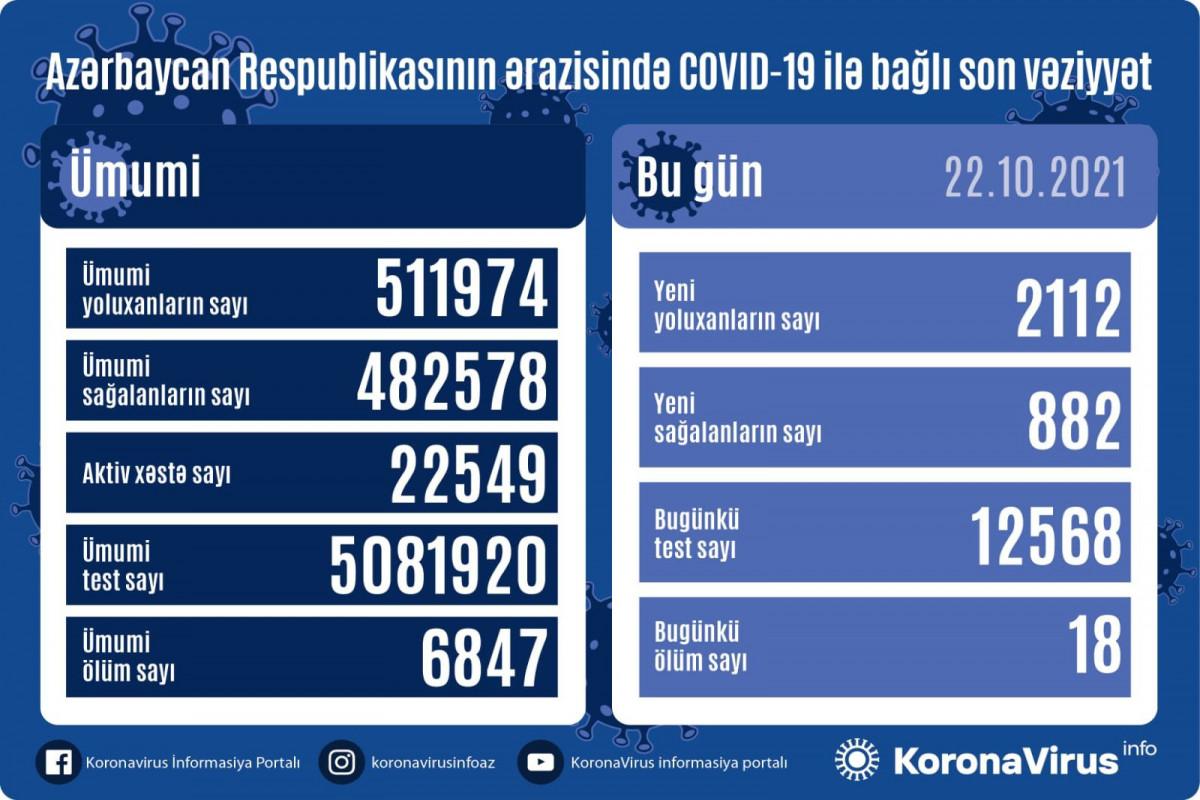 Azərbaycan Respublikasında koronavirus (COVID-19) infeksiyasına 2112 yeni yoluxma faktı qeydə alınıb, 882 nəfər müalicə olunaraq sağalıb.