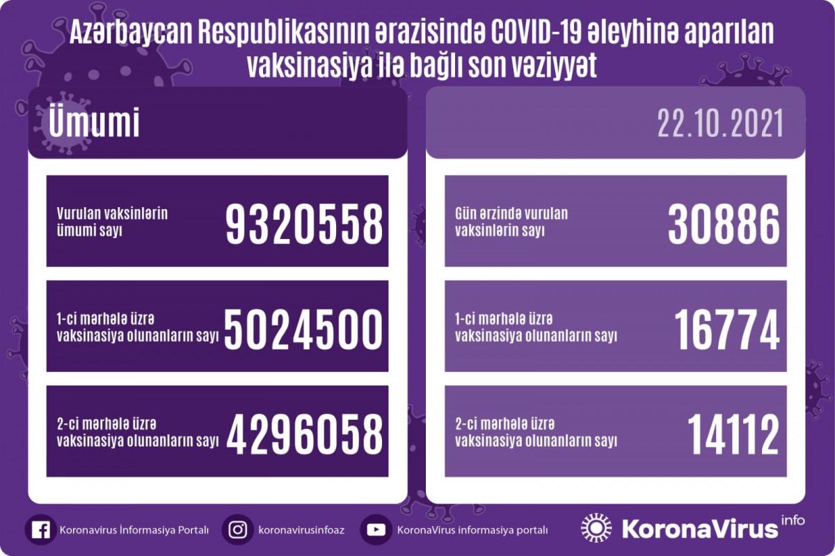 Azərbaycanda son sutkada koronavirus (COVID-19) əleyhinə 30 886 vaksin vurulub. Bir gündə birinci mərhələ üzrə vaksinasiya olunanların sayı 16 774, ikinci mərhələ üzrə vaksinasiya olunanların sayı 14 112 nəfərdir.