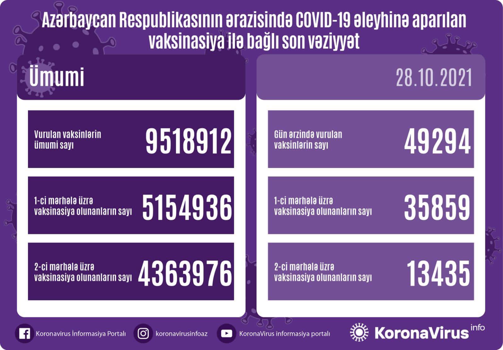 Azərbaycanda son sutkada koronavirus (COVID-19) əleyhinə 49 294 vaksin vurulub. Bir gündə birinci mərhələ üzrə vaksinasiya olunanların sayı 35 859, ikinci mərhələ üzrə vaksinasiya olunanların sayı 13 435 nəfərdir.