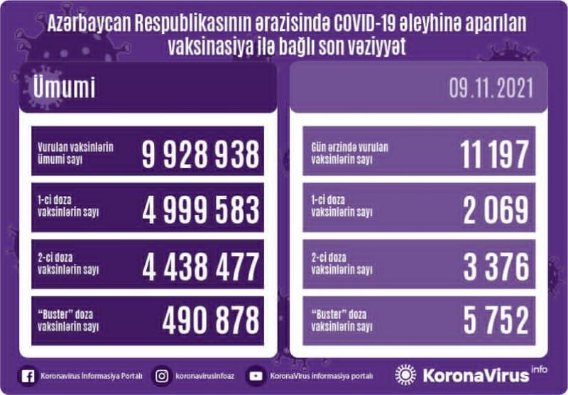 Azərbaycanda son sutkada koronavirus (COVID-19) əleyhinə 11197 vaksin vurulub. Bir gündə birinci mərhələ üzrə vaksinasiya olunanların sayı 2 069, ikinci mərhələ üzrə vaksinasiya olunanların sayı 3 376, "buster" doza üzrə vaksinasiya olunanların sayı isə 5752 nəfərdir.