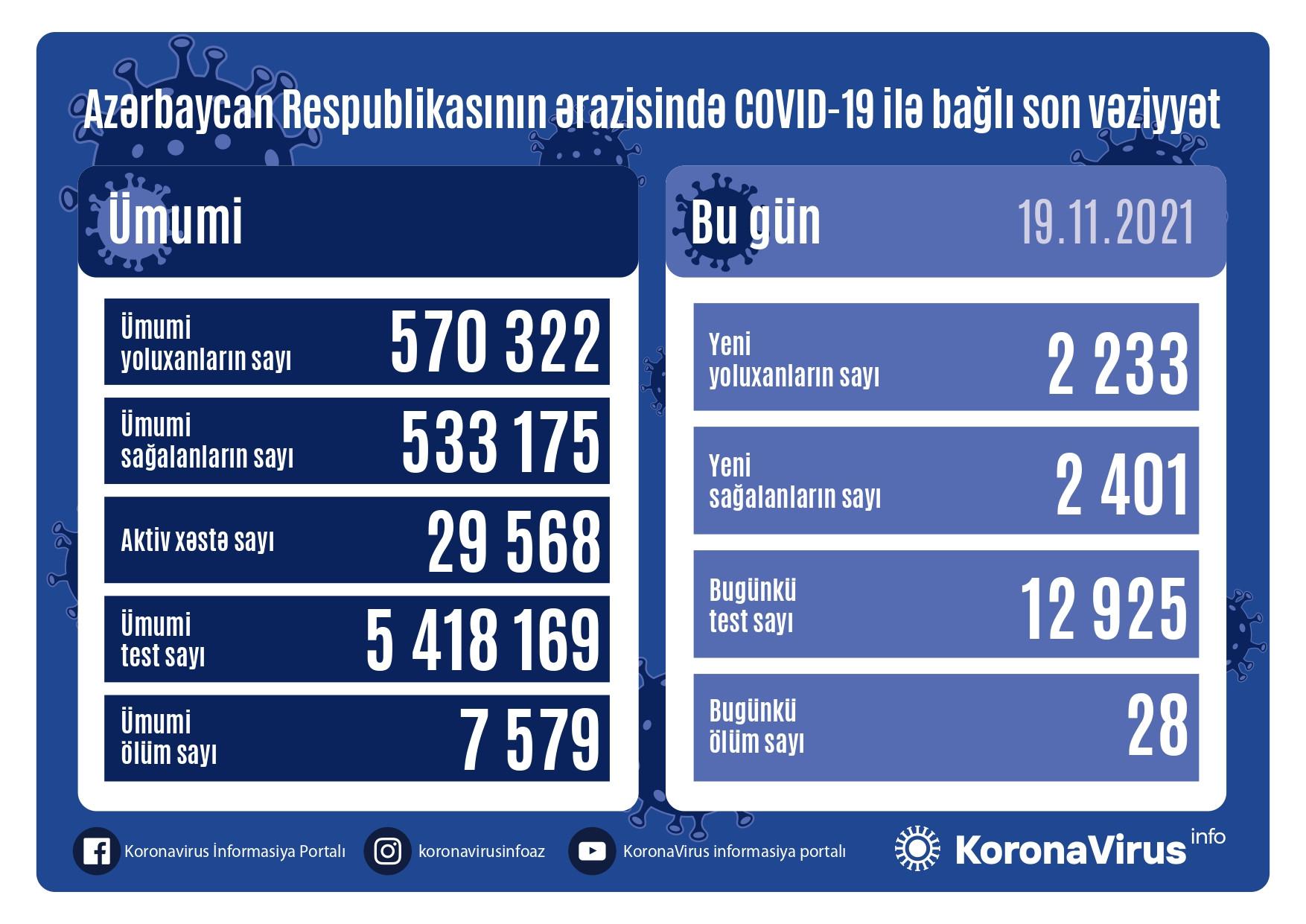 Azərbaycanda koronavirus (COVID-19) infeksiyasına 2233 yeni yoluxma faktı qeydə alınıb, 2401 nəfər müalicə olunaraq sağalıb.